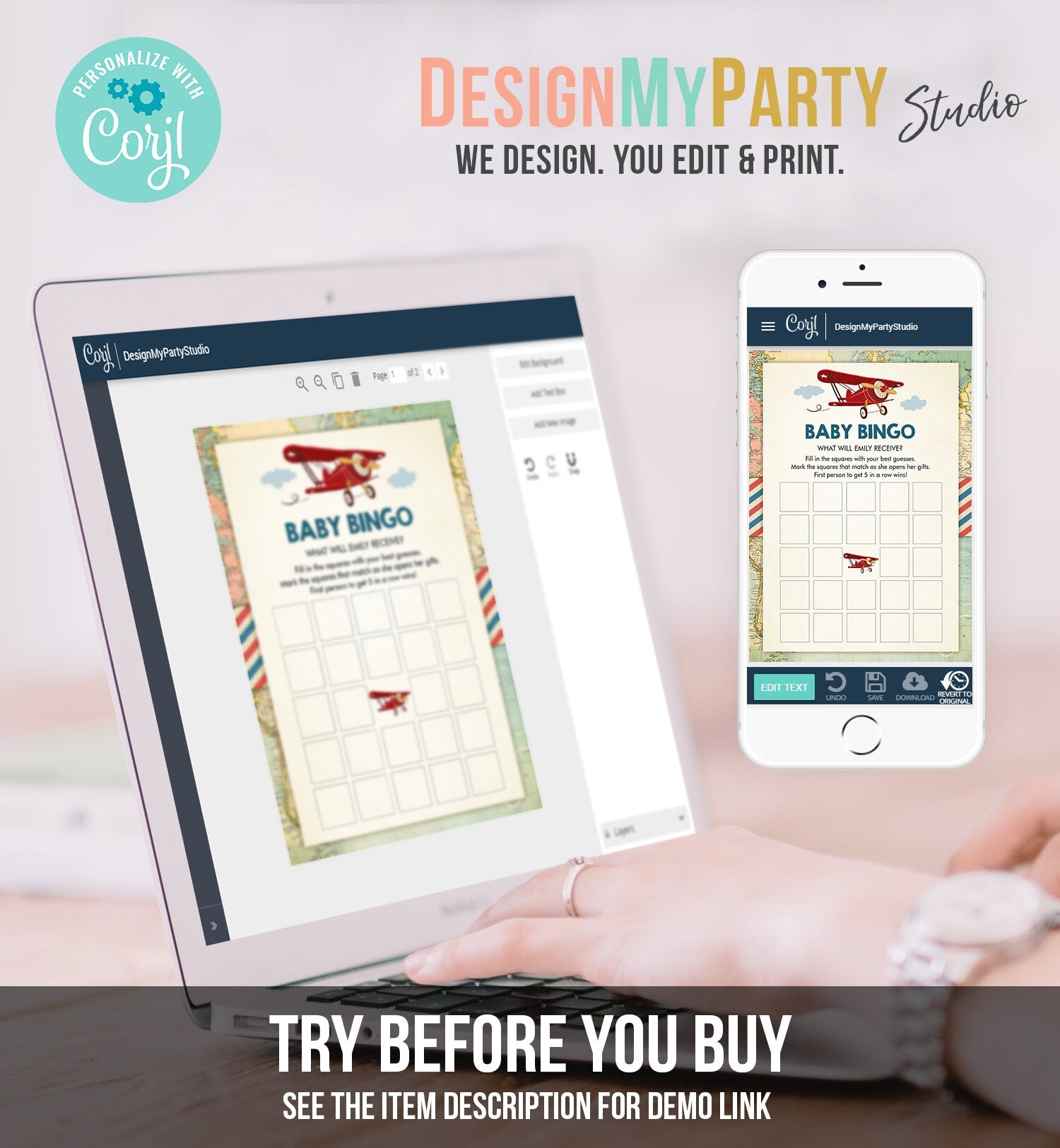 • Editable Baby Bingo Game Vintage Airplane Red Travel Adventure Shower Game Baby Coed Sprinkle Games Download Corjl Template Printable 0011