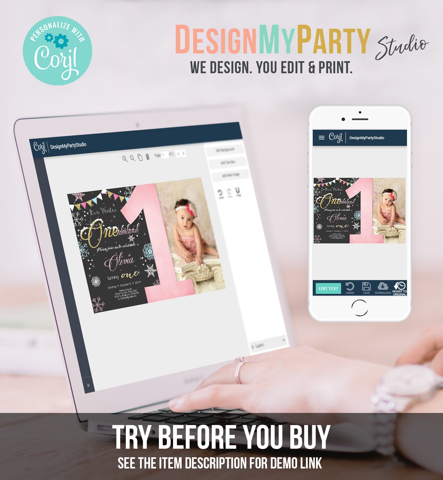 You can edit, add and remove text, font colors, move and resize the text boxes ("Winter Onederland" and the '1' are NOT editable).