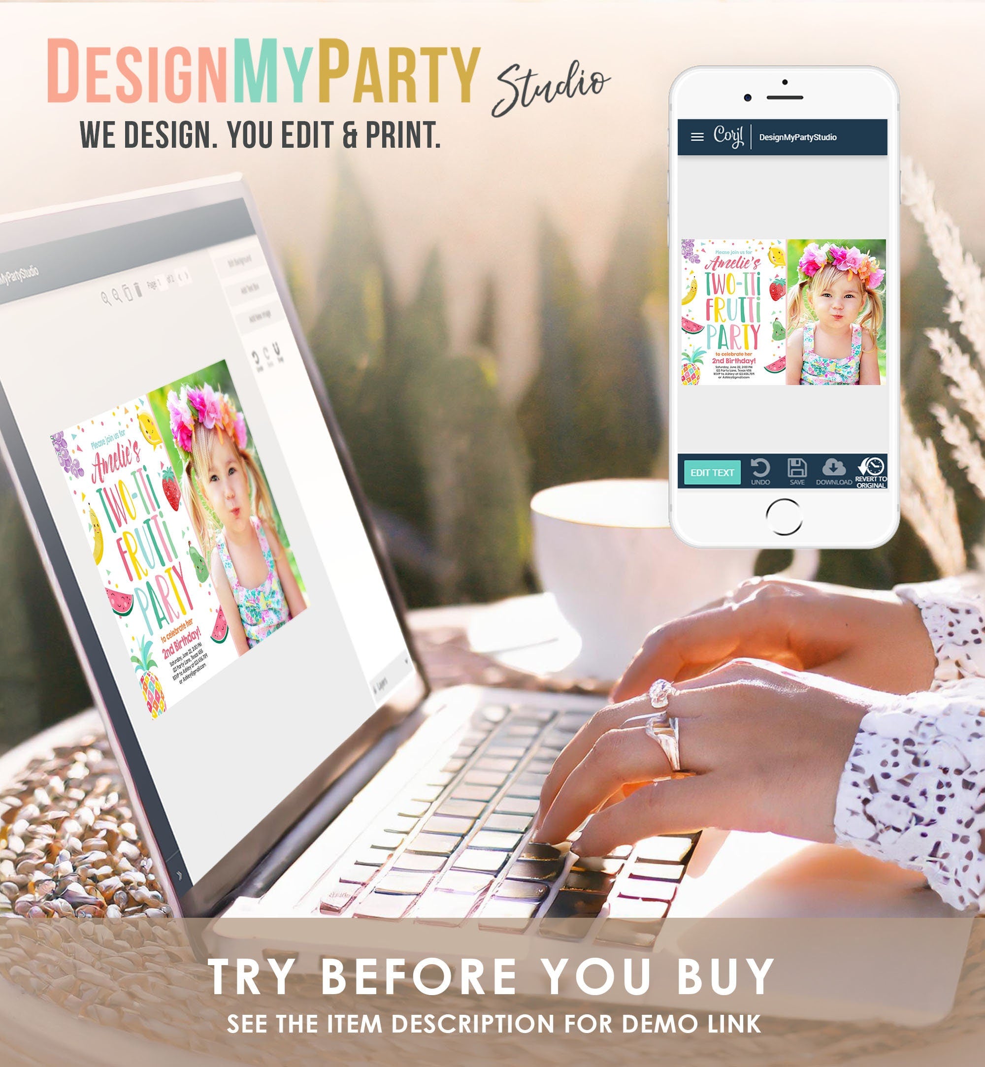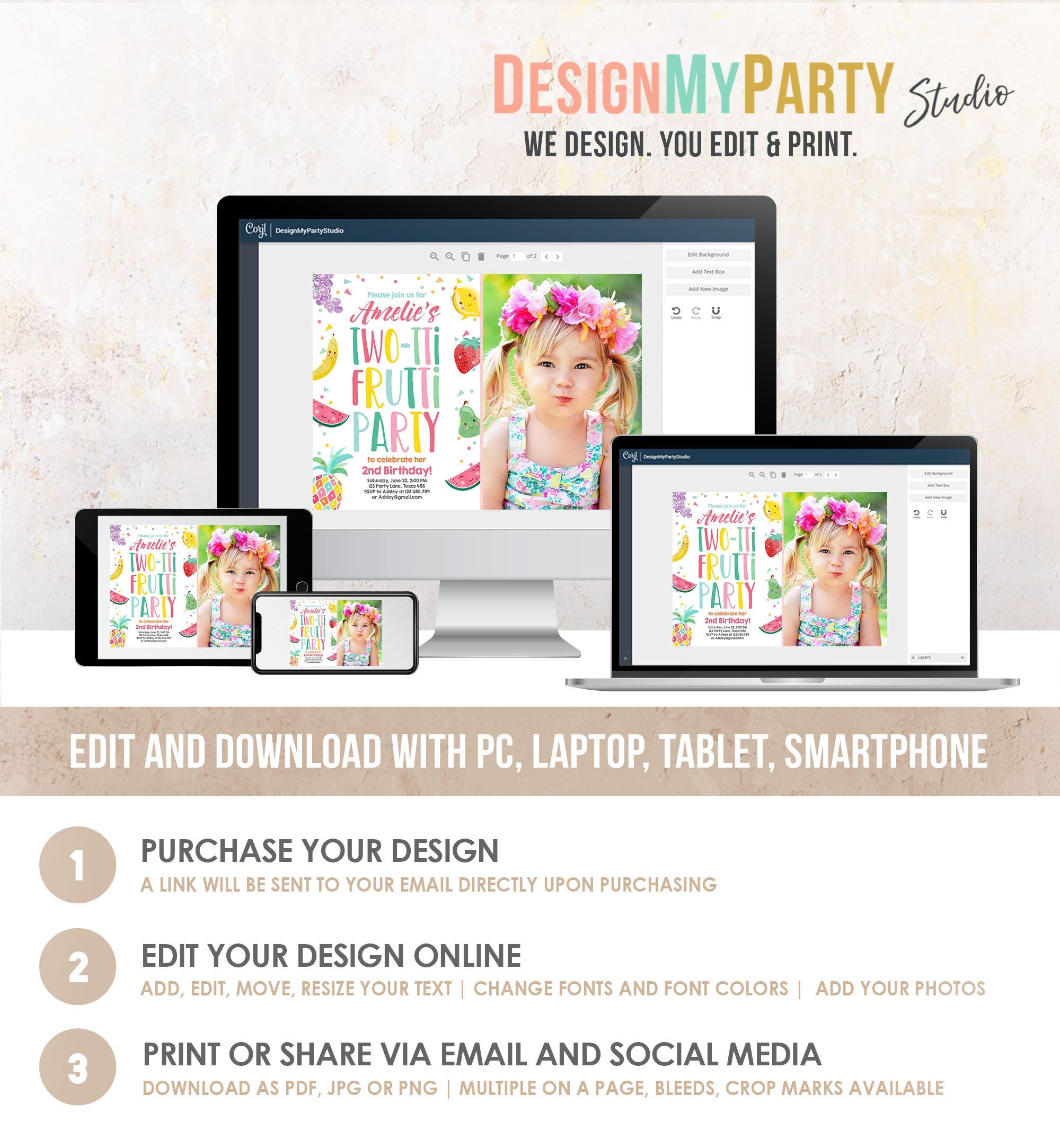 You can edit, add and remove text, font colors, move and resize the text boxes ("Two-tti Frutti Party" is NOT editable).