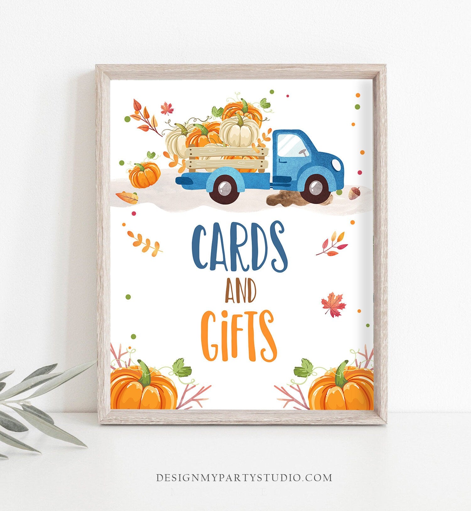 • Cards and Gifts Sign Pumpkin Birthday Boy Table sign Pumpkin Party Signs Decor Fall Party Autumn Blue Pumpkin Truck Decor PRINTABLE 0153