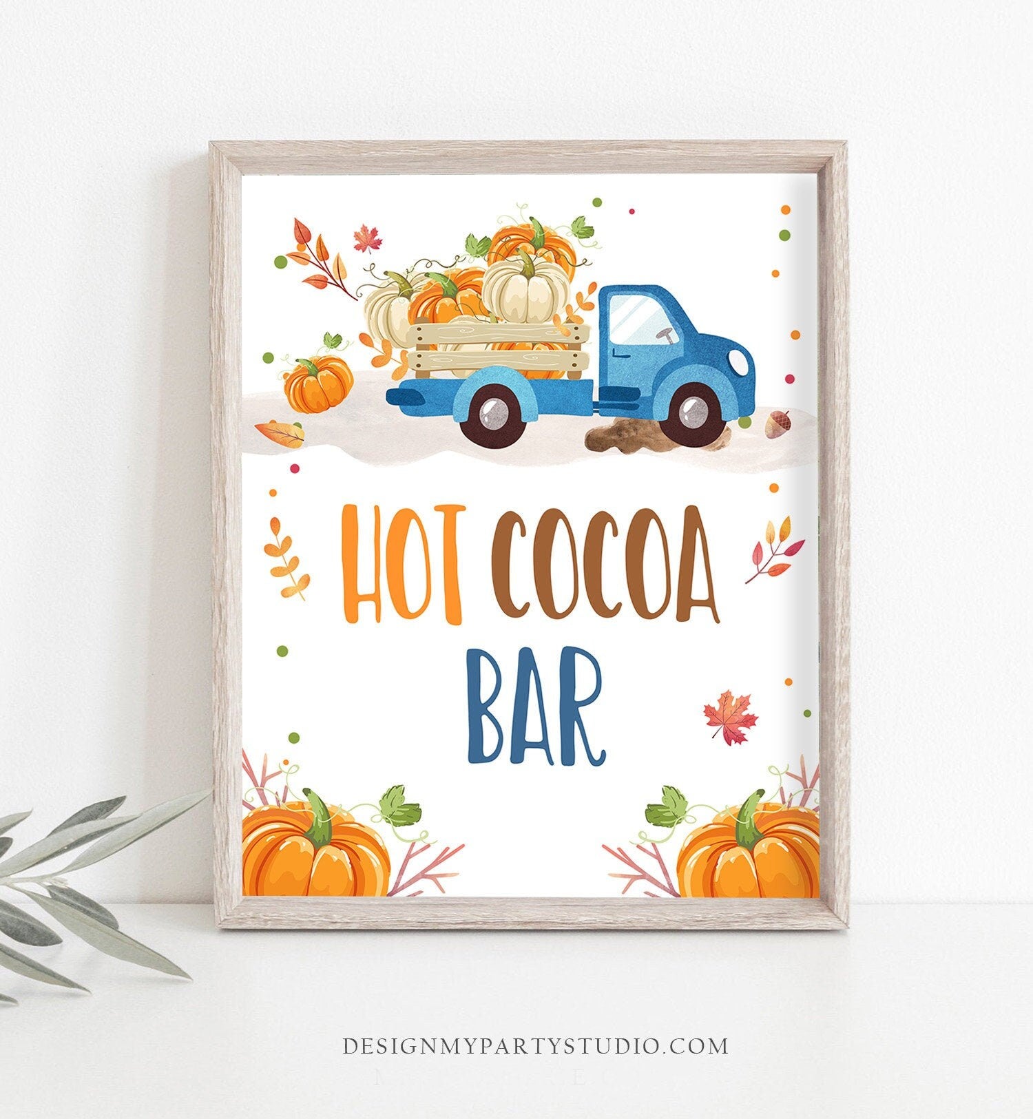 • Hot Cocoa Bar Sign Little Pumpkin Truck Boy Birthday Table Sign Blue Leaves Fall Party Autumn Pumpkin Hot Chocolate Download PRINTABLE 0153