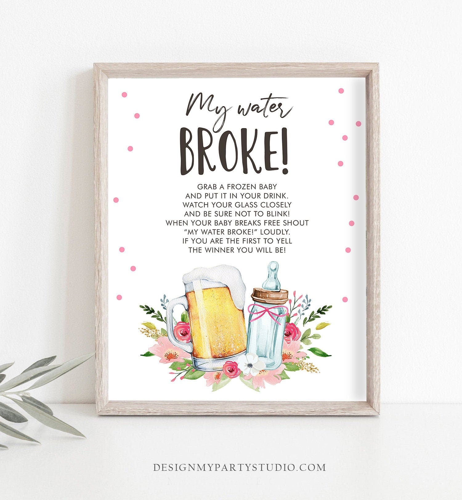 • My Water Broke Baby is Brewing Baby Shower Game Sign Table Decor Gift Bottles Beers Greenery Activity Ice Sign Pink Girl Printable 0190