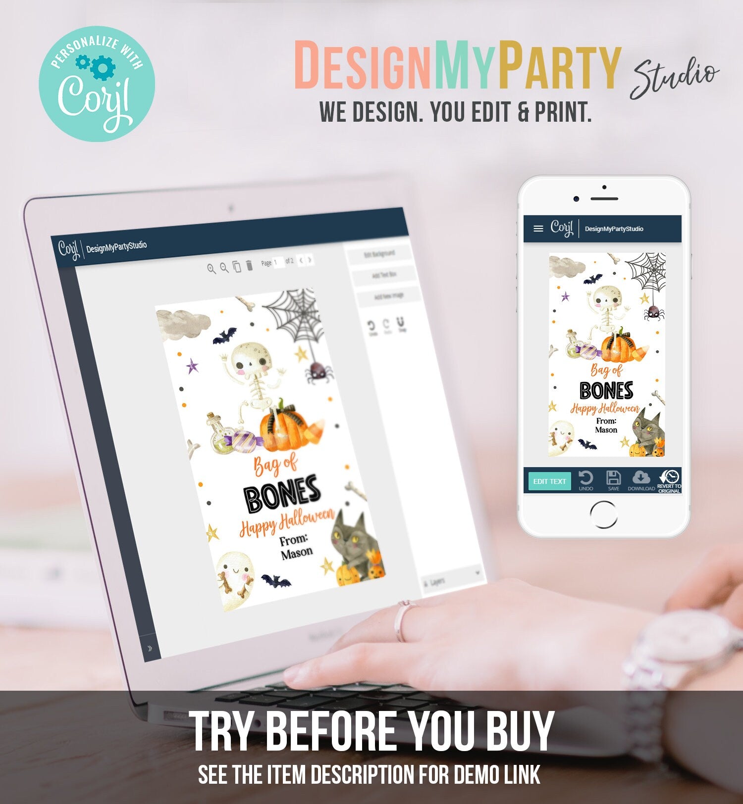 • Editable Halloween Gift Tag Skeleton Gift Tags Trick Or Treat Halloween School Treat Bag of Bones Tag Download Printable Template Corjl 0261
