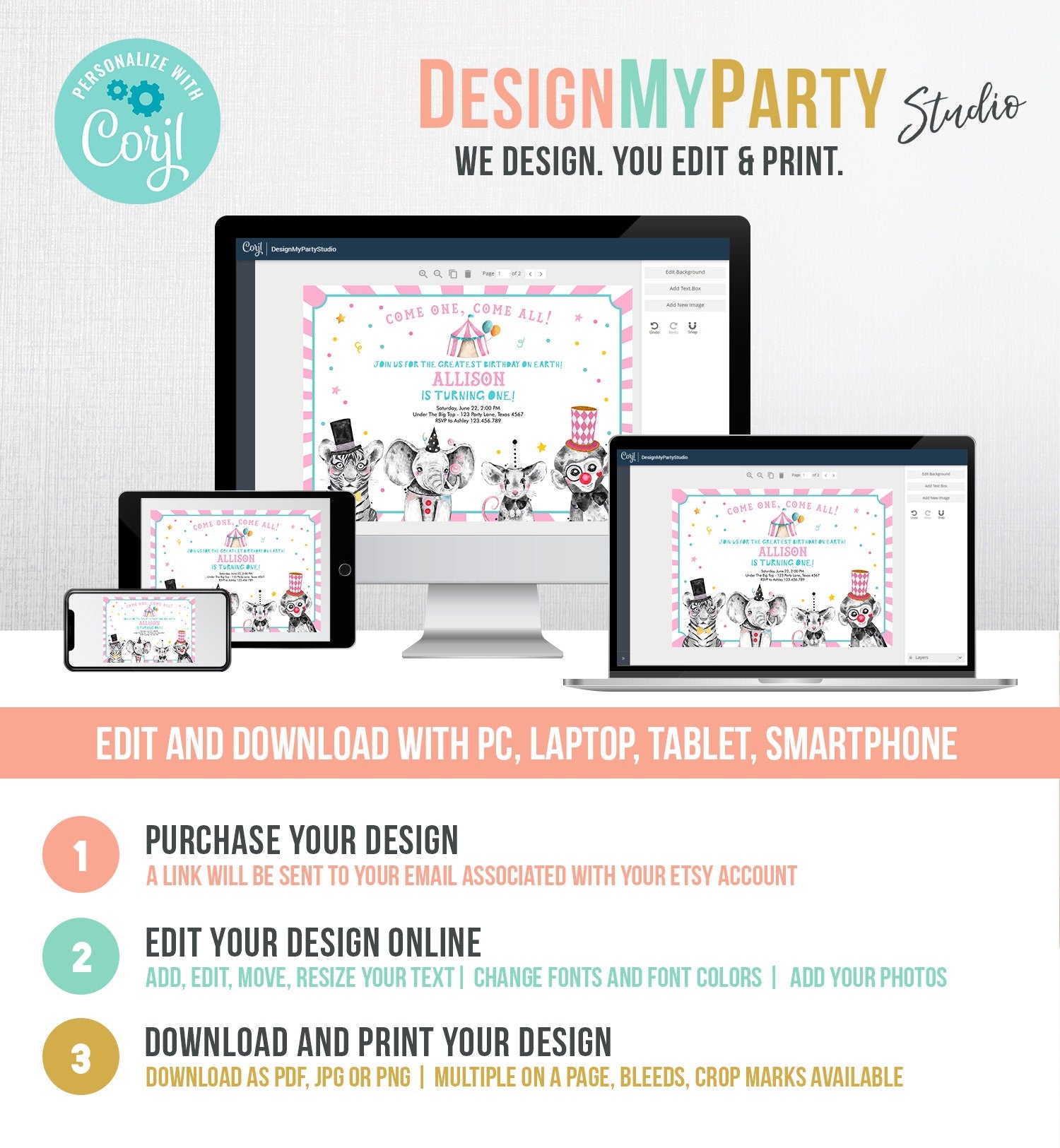 • Editable Circus Birthday Invitation Girl Pink Circus Animals Invitation Carnival Invite Download Printable Template Digital Corjl 0355