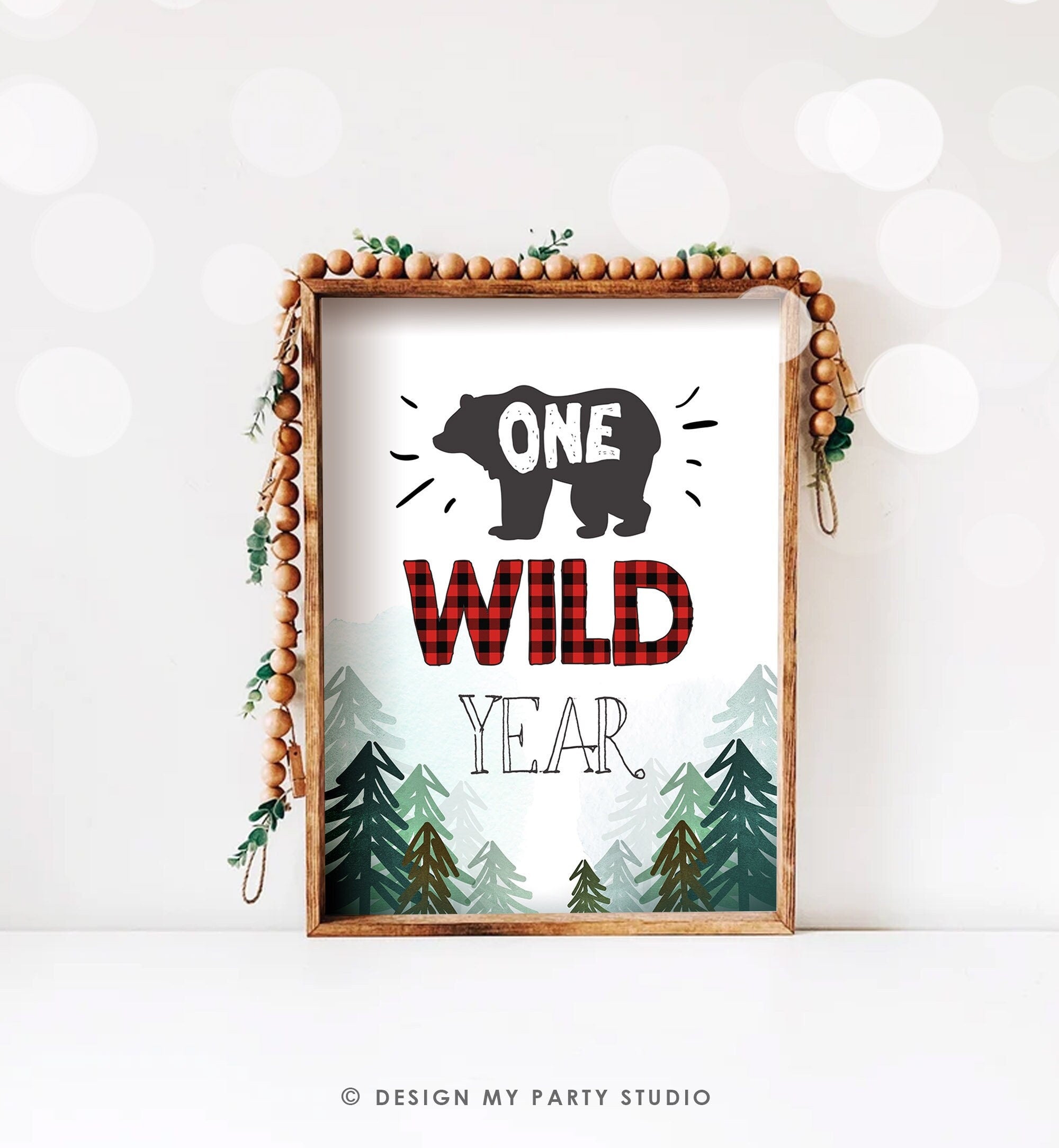 • One Wild Year Sign Lumberjack Outdoor Bear Wild One Woodland Party Forest Red Buffalo Plaid First Birthday Instant Download Printable 0377