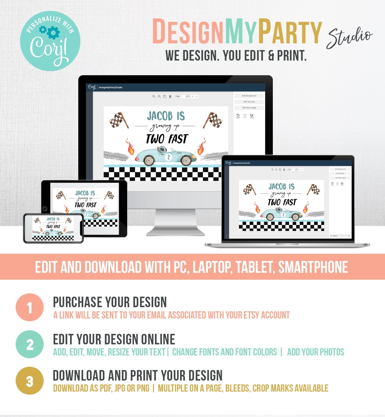 Once payment is confirmed, you will get an email containing the link for you to access your editable design.