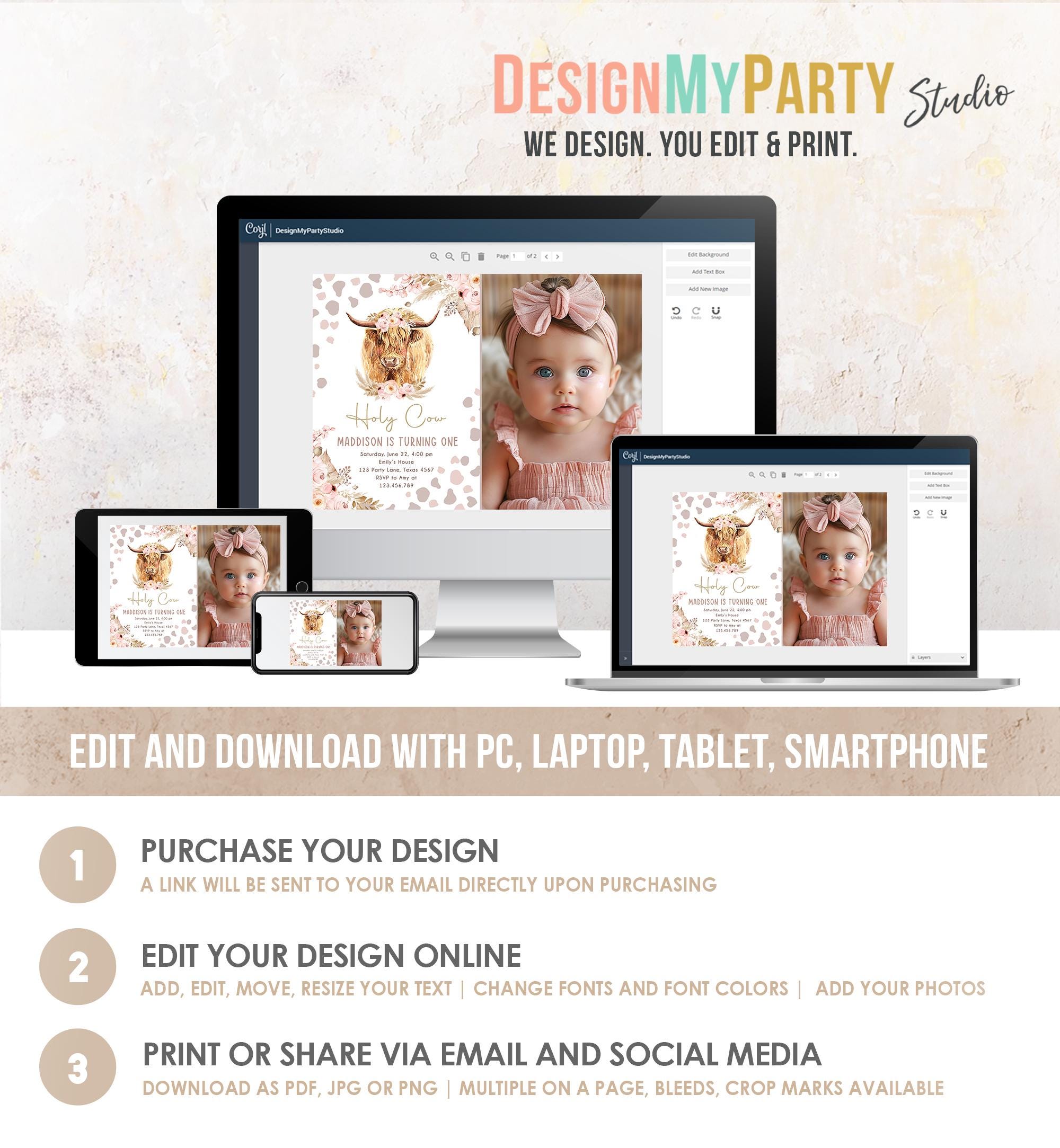 • Editable Holy Cow Birthday Invitation Boho Girl Farm Animals Pink Floral Pampas Grass 1st Highlander Digital Evite Template Printable 0453