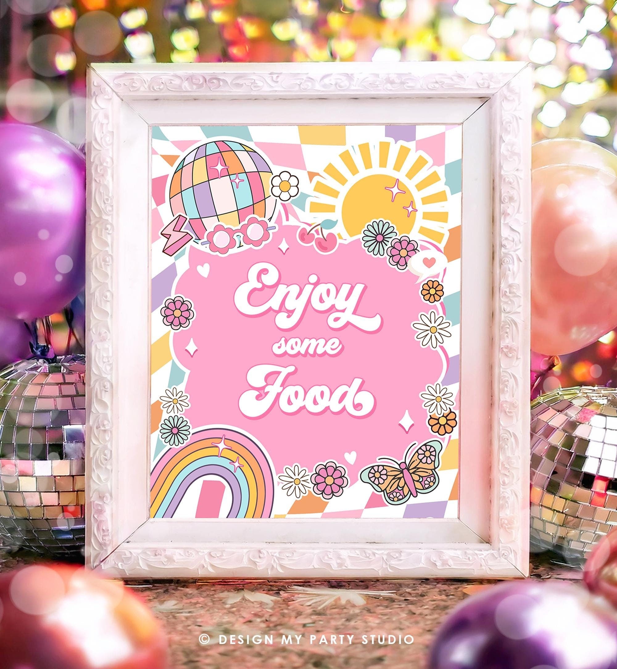• Enjoy Some Food Sign Groovy Birthday Baby Shower Rainbow Sunshine Girl Pink Peace Love Party Retro Hippie Digital Download Printable 0524
