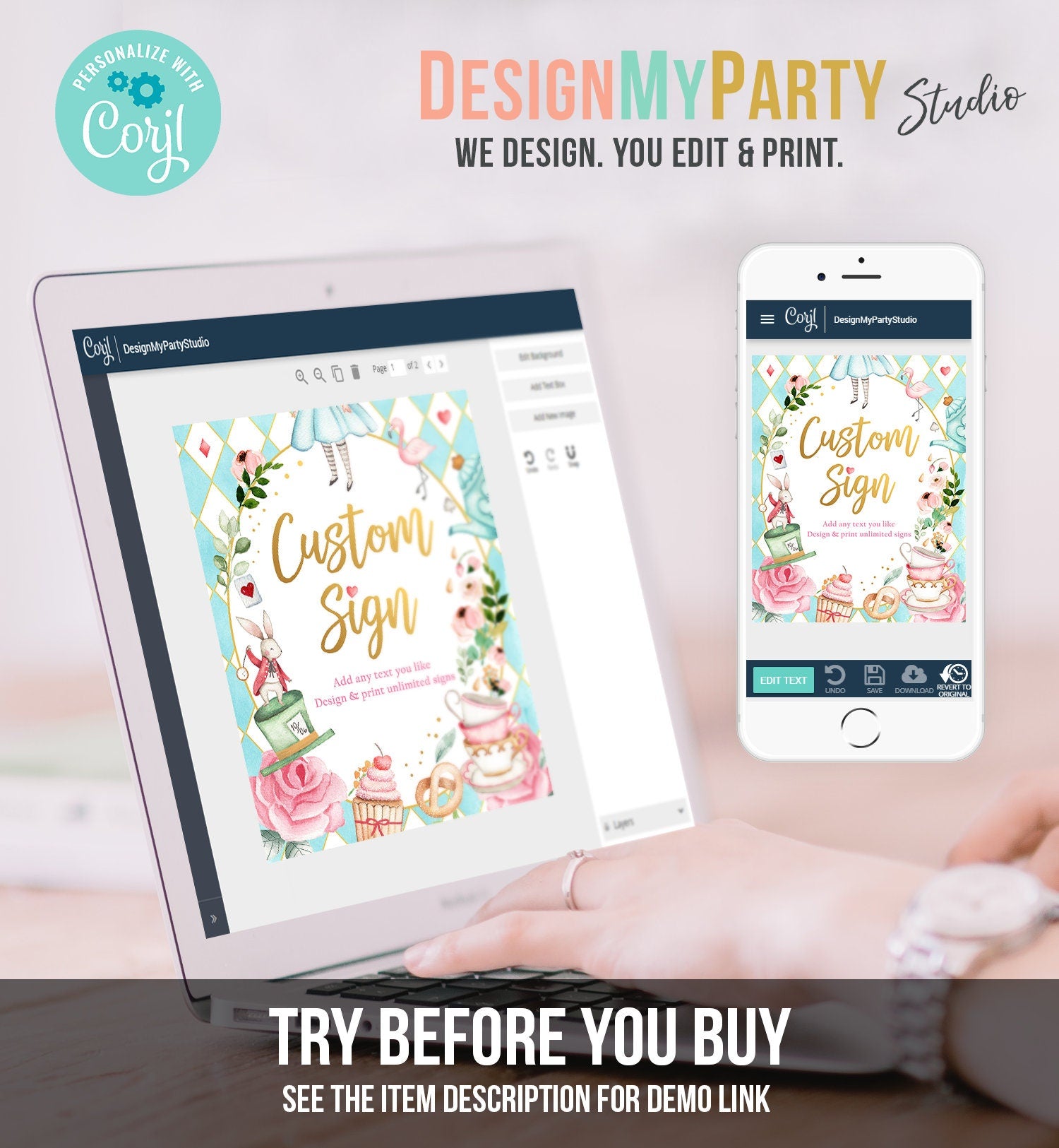 • Editable Custom Sign Alice in Wonderland Tea Party Onederland Blue First 1st Table Sign Shower Decor Corjl Template Printable 8x10 0350