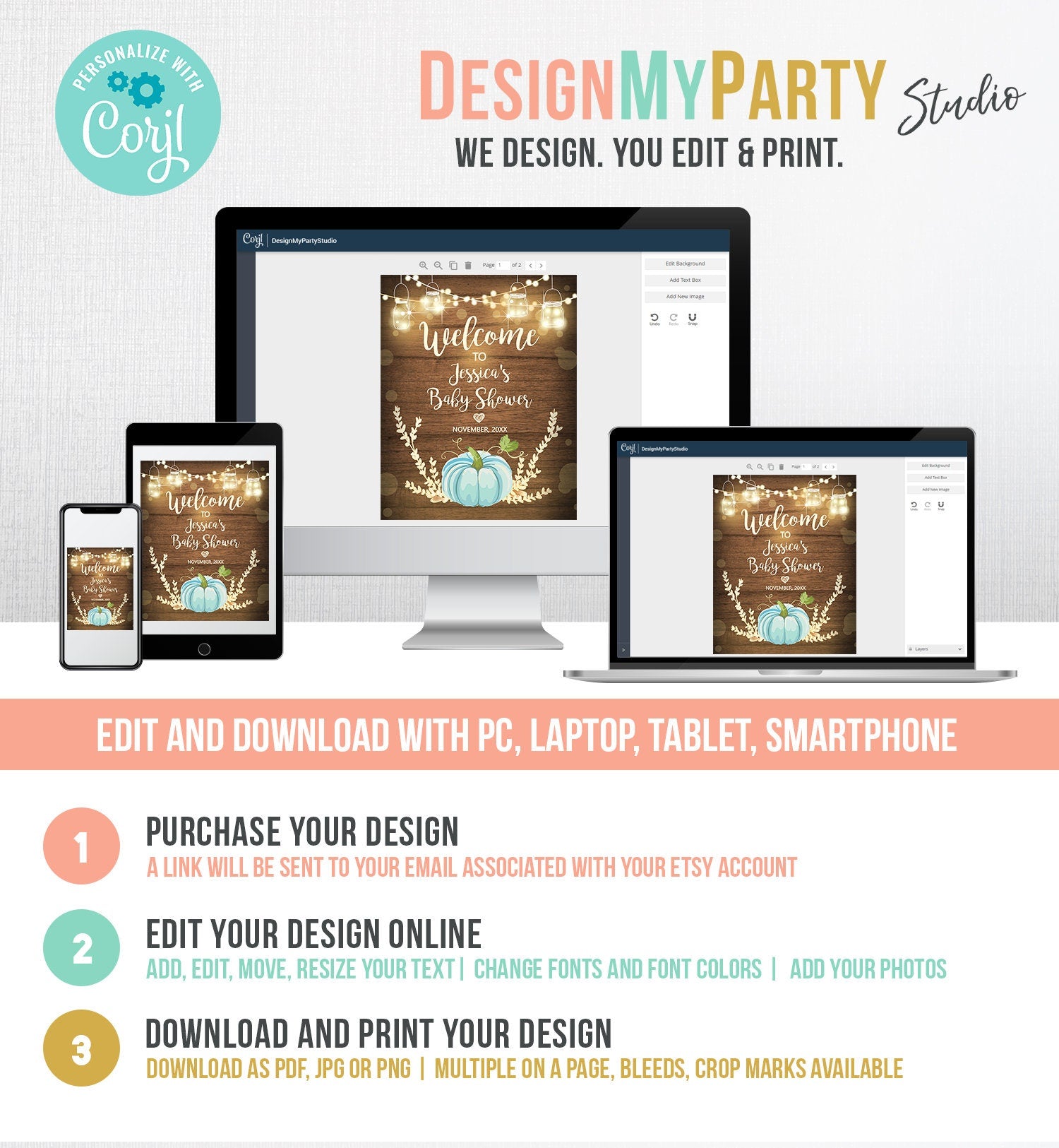 • Editable Blue Pumpkin Baby Shower Welcome Sign Rustic Wood Boy Birthday Couples Shower Fall Autumn Pumpkin Party Corjl Template 0015