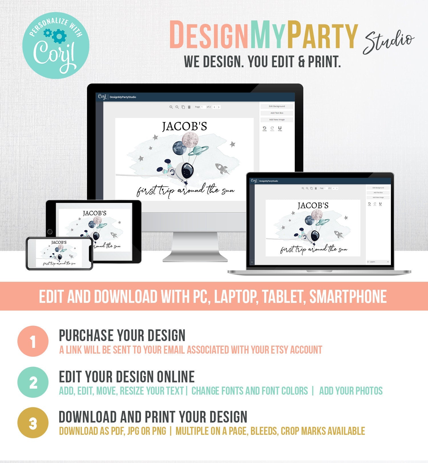 • Editable Outer Space Backdrop Banner Space Birthday Boy Blue First Trip Around the Sun Galaxy Planets Download Corjl Template Printable 0366