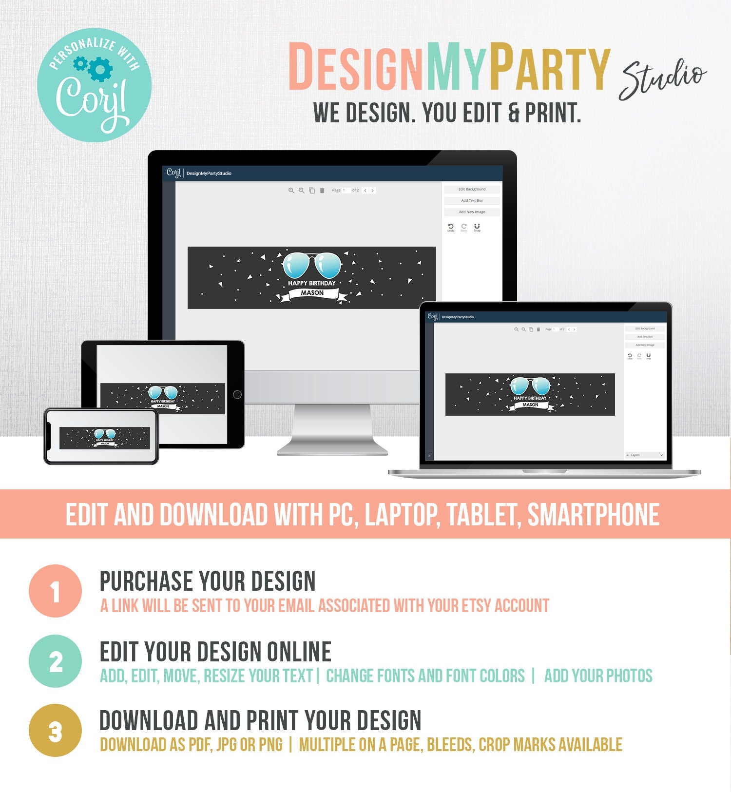• Editable Water Bottle Labels Sunglasses Two Cool Birthday Boy 2nd Birthday Summer I'm This Many Palm Decor Printable Template Corjl 0136