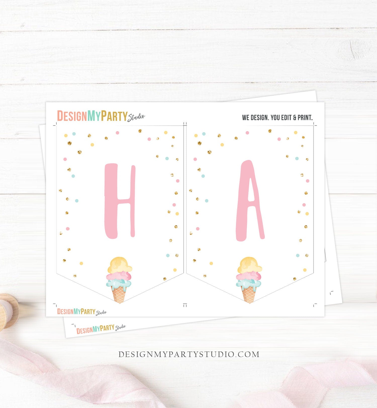 • Happy Birthday Banner Pink Ice Cream Birthday Banner Ice Cream Party Girl Birthday Decorations Instant Digital Download Printable 0243