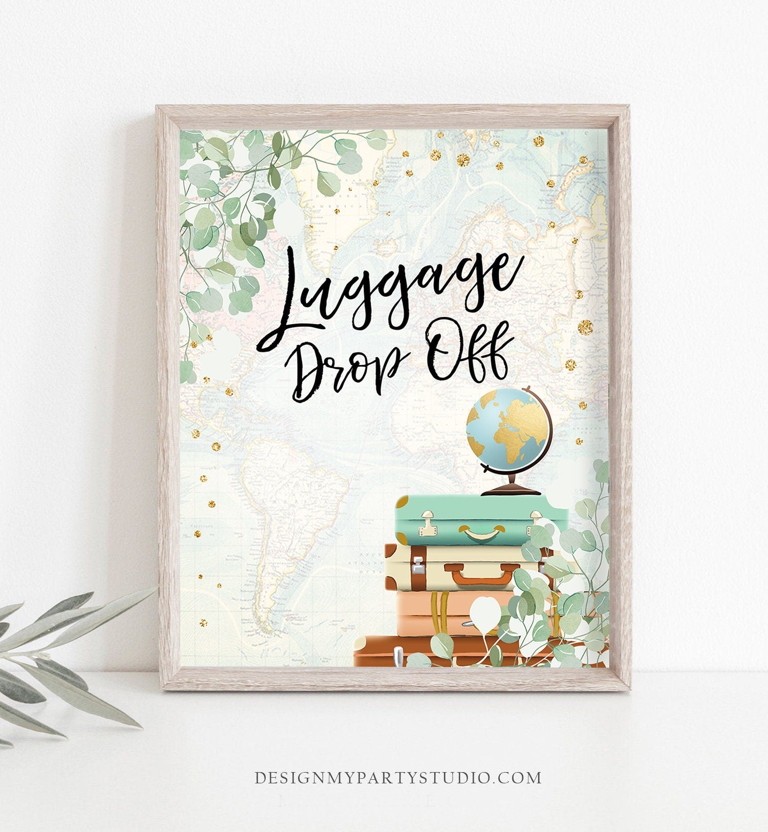 • Luggage Drop Off Sign Travel Adventure Bridal Shower Wedding Birthday Eucalyptus Globe Suitcase Gold Confetti Download Printable 0030