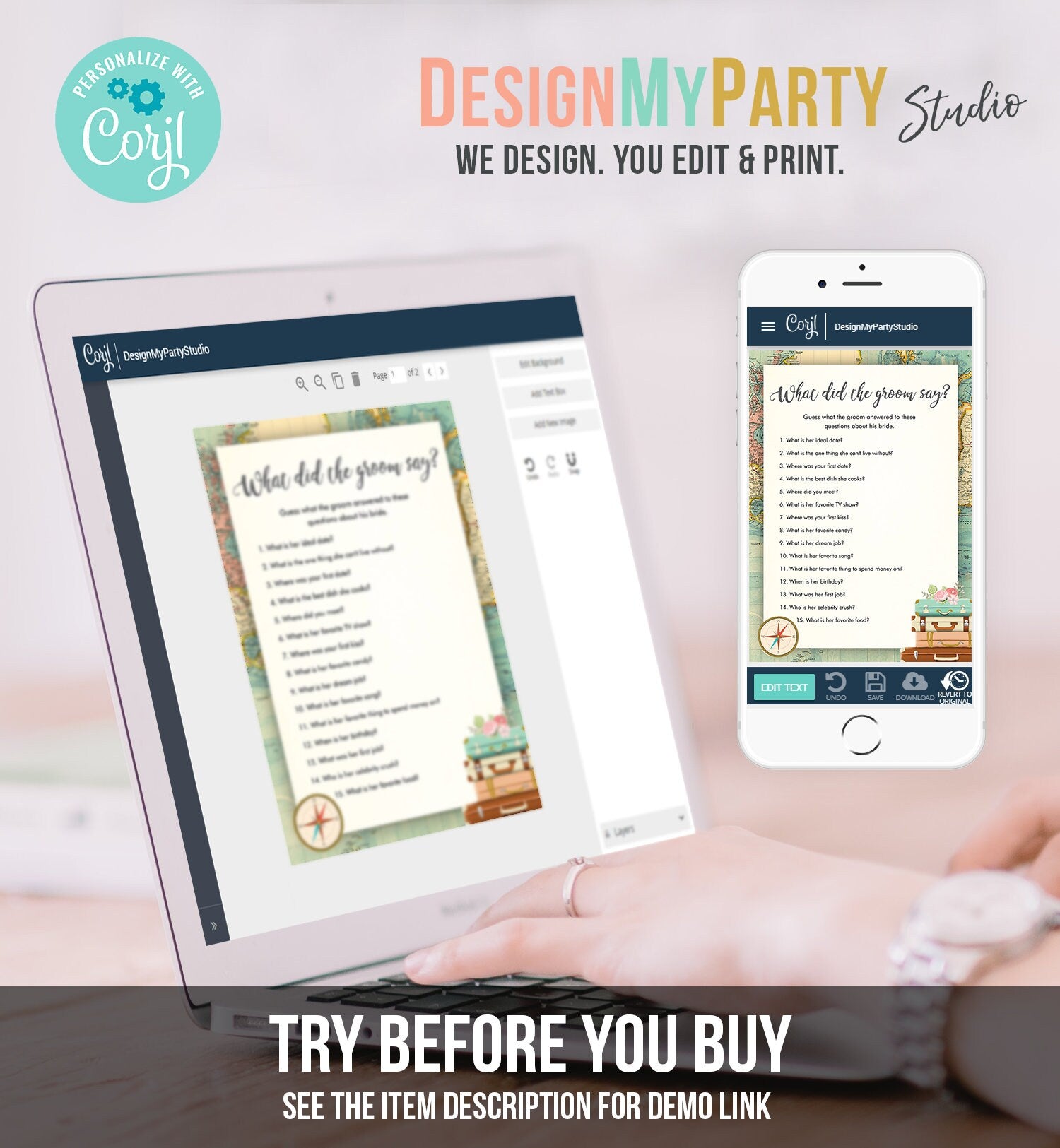You can edit, add and remove text, font colors, move and resize the text boxes ("What did the groom say?" is NOT editable).