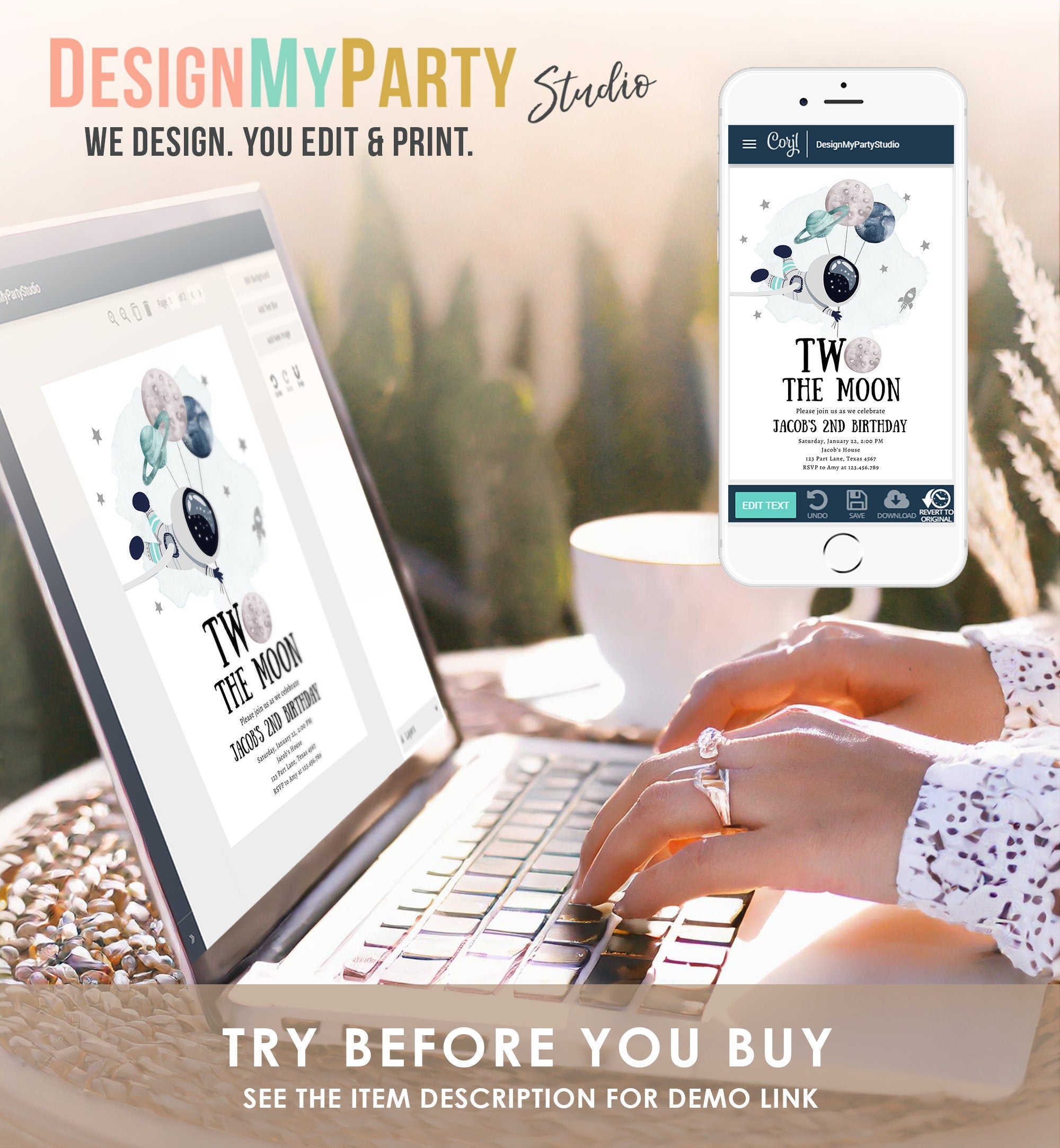 • Editable Two the Moon Outer Space Birthday Invitation Out of this World Astronaut Blue Silver Boy Second 2nd Evite Template Printable 0366