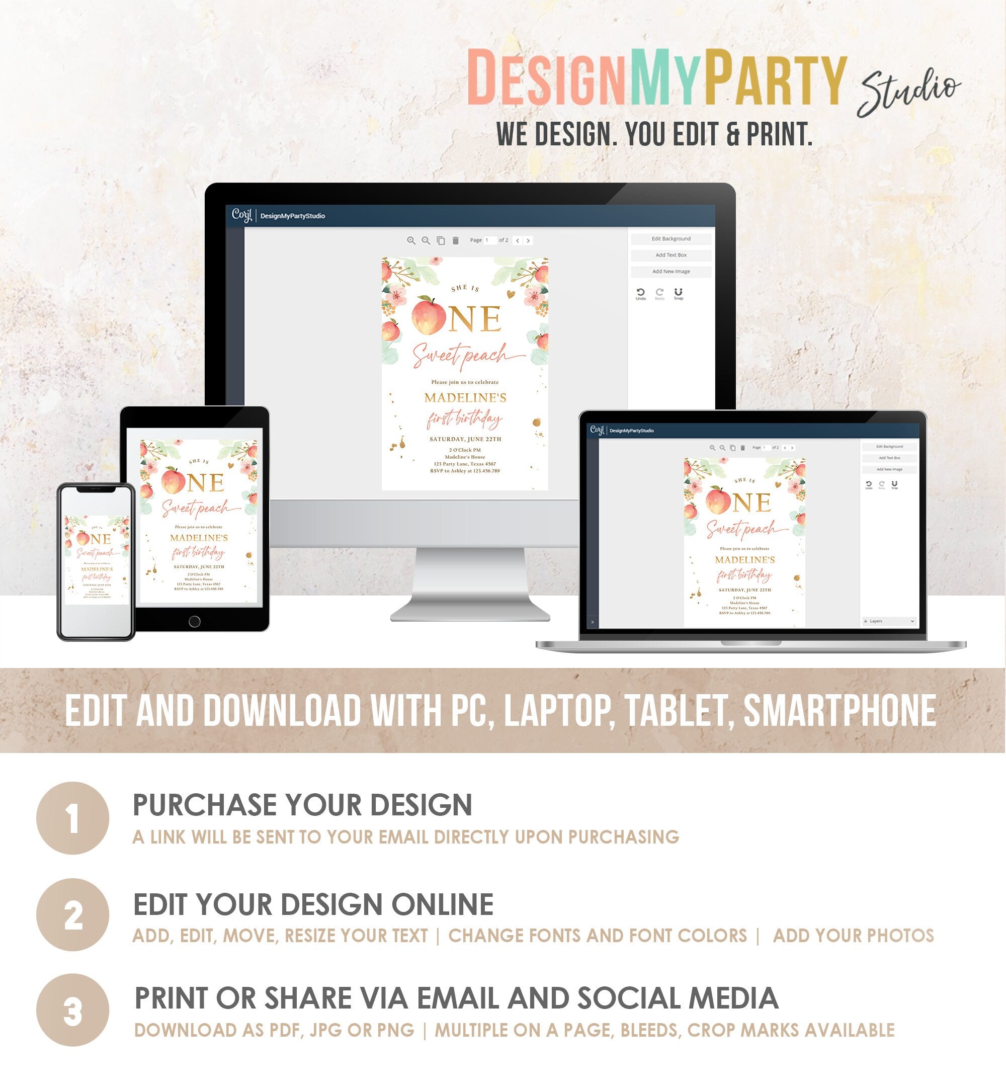 • Editable One Sweet Peach First Birthday Invitation 1st Birthday Sweet Peach Girl Boho Peaches Digital Download Evite Template Printable 0401