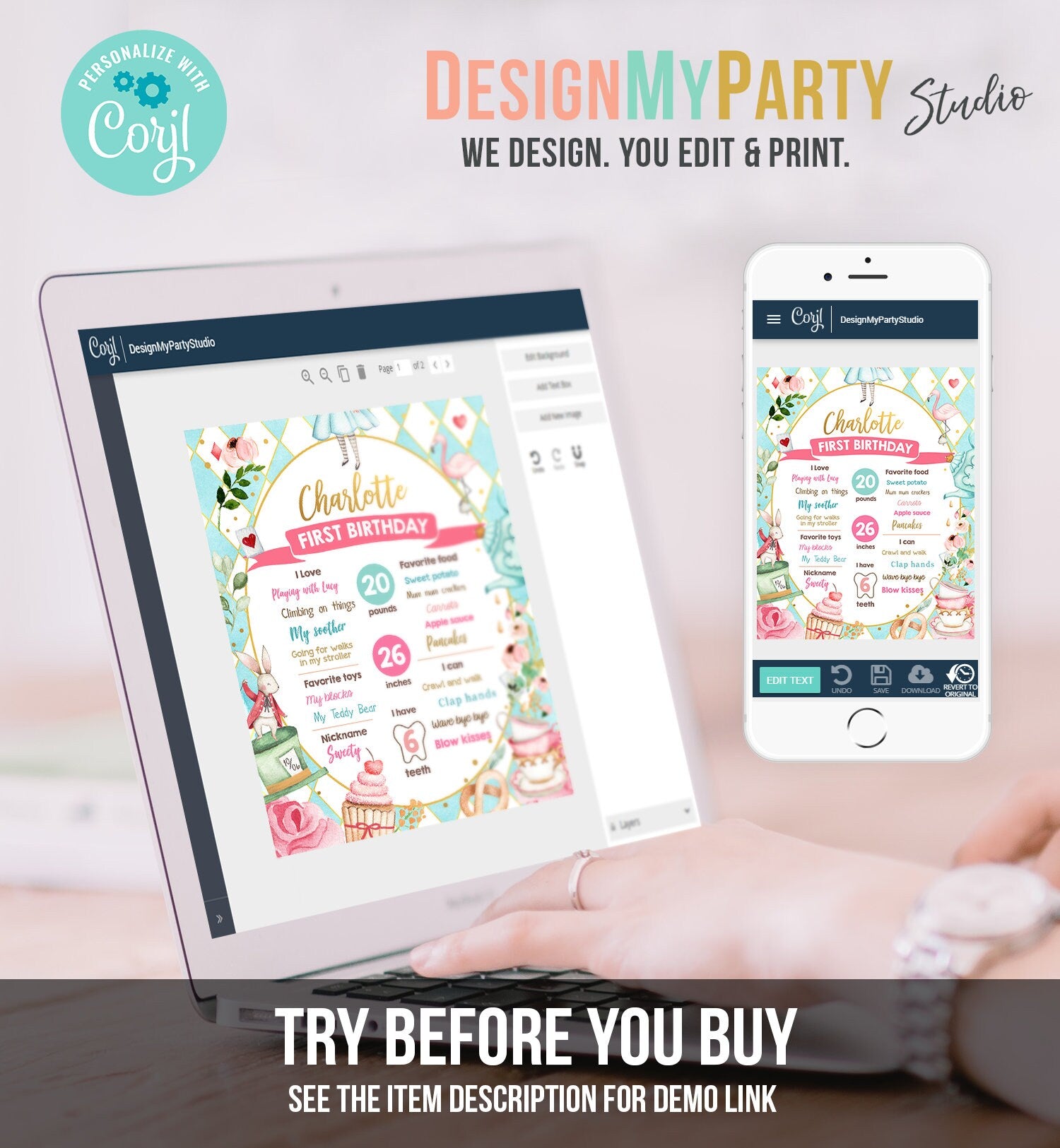 • Editable Alice in Onederland Birthday Milestones Sign Girl First Birthday 1st Alice in Wonderland Chalkboard Corjl Template Printable 0350
