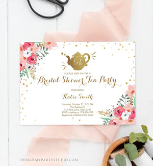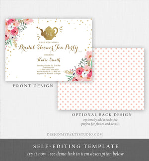 • Editable Bridal Shower Tea Party Invitation Floral Tea pot Invite Pink and Gold Wedding Luncheon Download Printable Template Corjl Digital