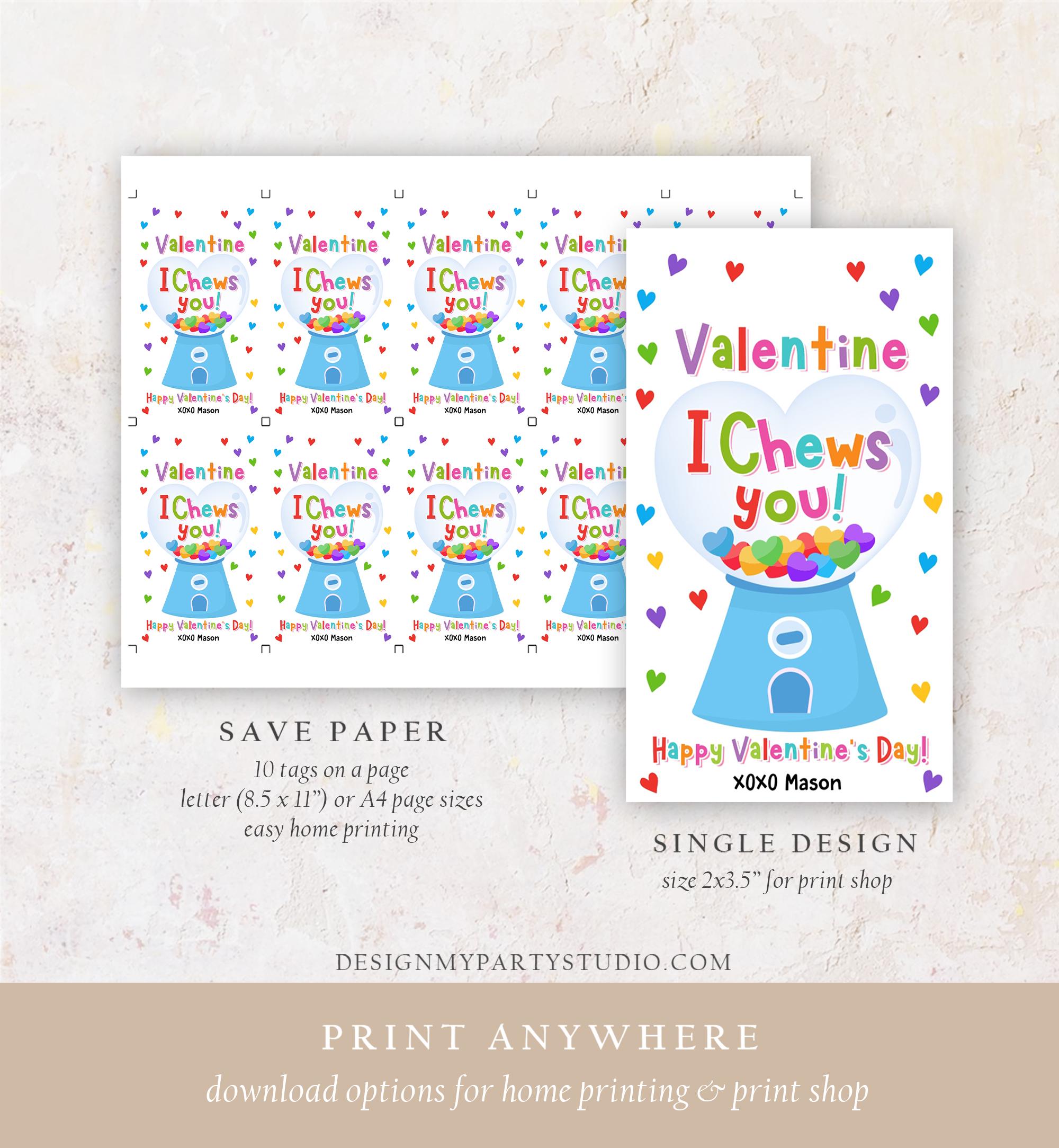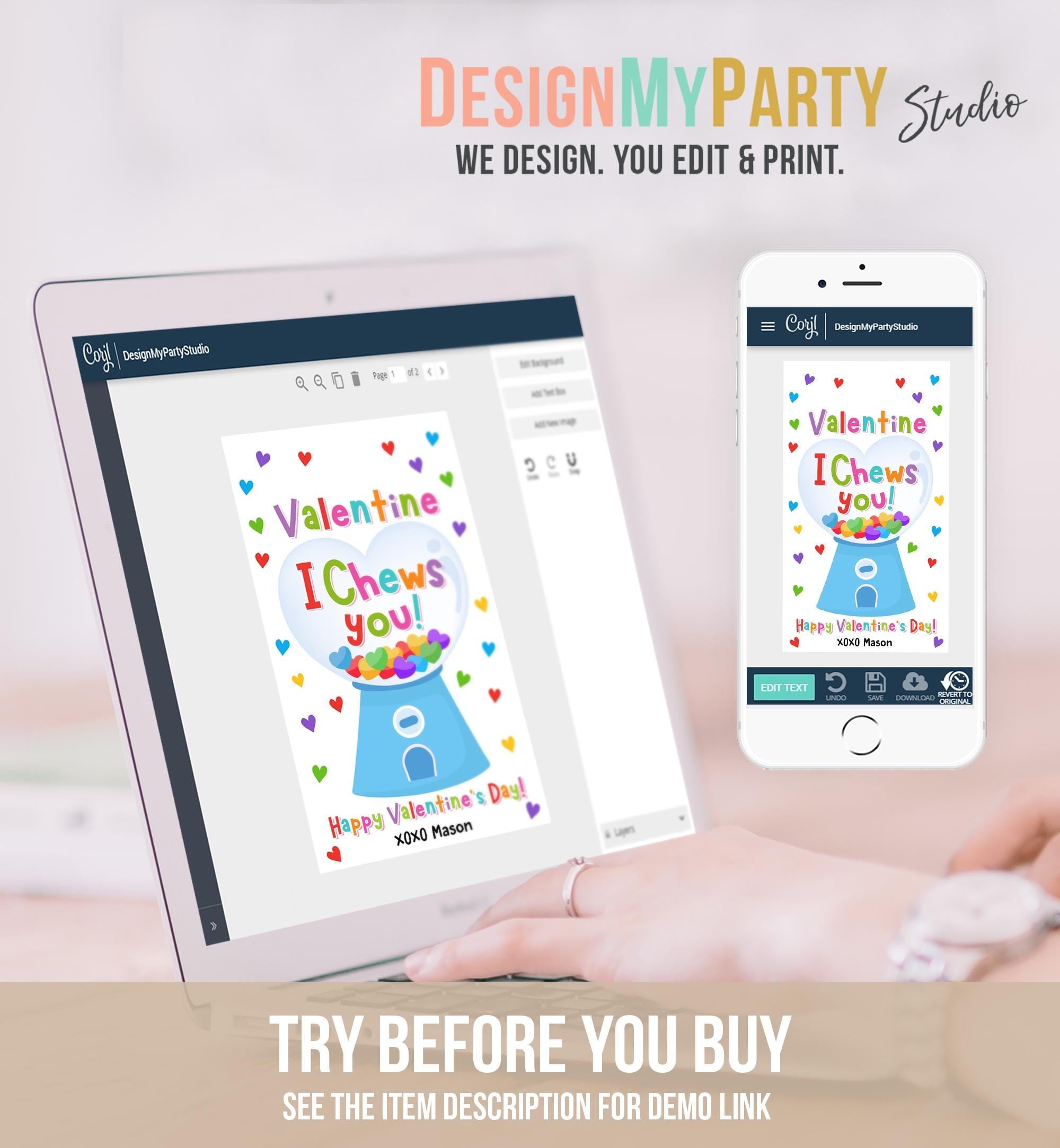You can edit, add and remove text, font colors, move and resize the text boxes ("Valentine I Chews You" is NOT editable).