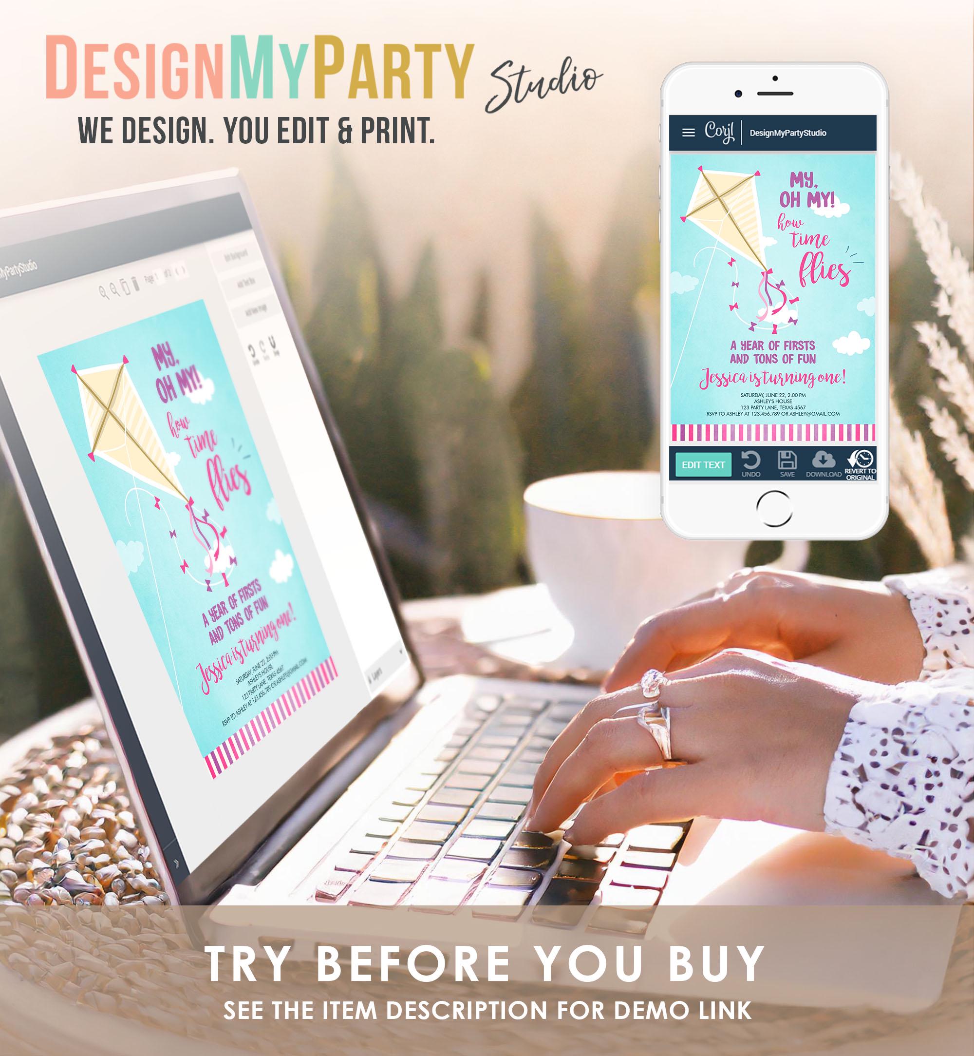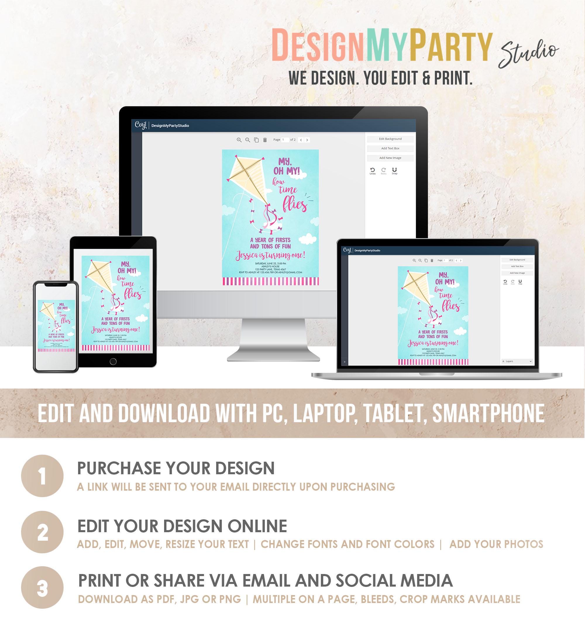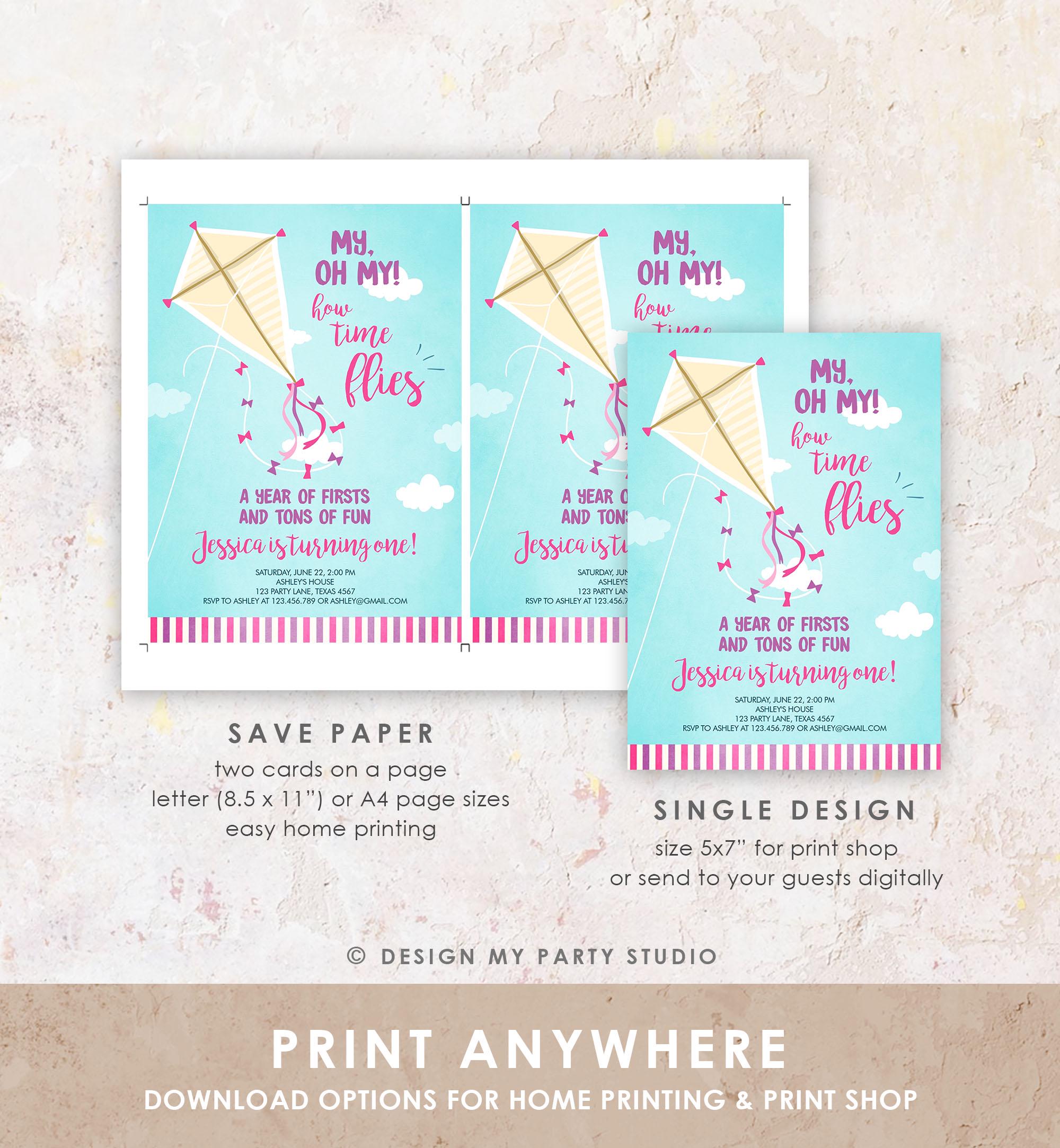 • Editable Kite Birthday Invitation Oh My Time Flies First Birthday Girl Pink Park 1st Birthday Invite Download Printable Evite Template 0316