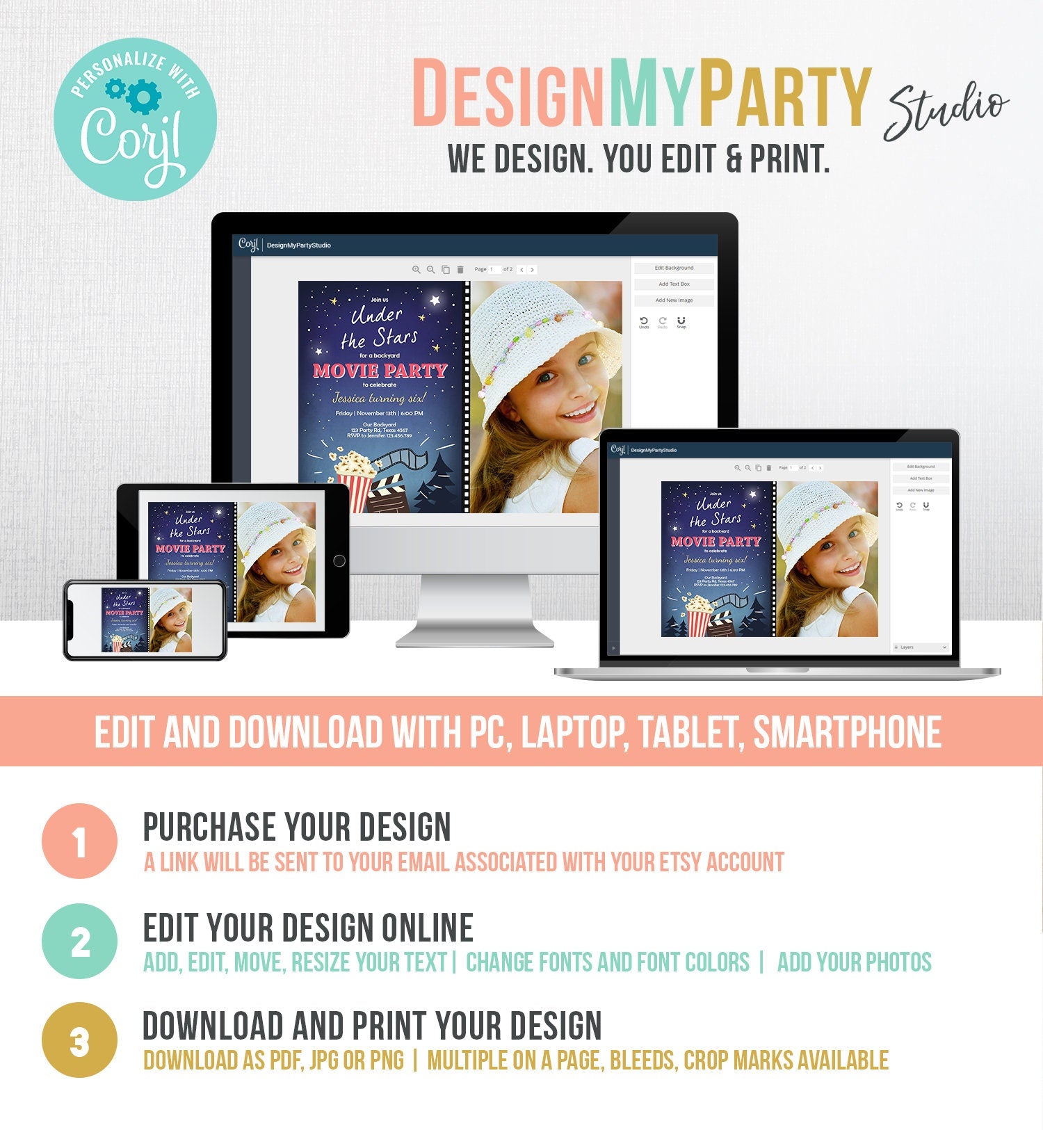 • Editable Movie Night Invitation Under the Stars Outdoor Backyard Movie Party Popcorn Birthday Download Printable Template Corjl 0177