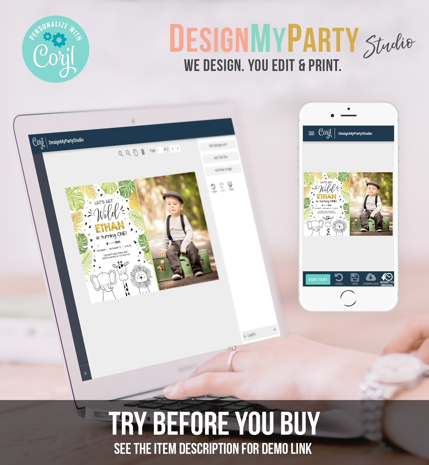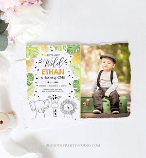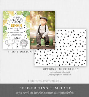 • Editable Safari Animals Birthday Invitation Boy Girl First Birthday Let's Get Wild One Jungle Zoo Animals Black Modern Corjl Template 0039