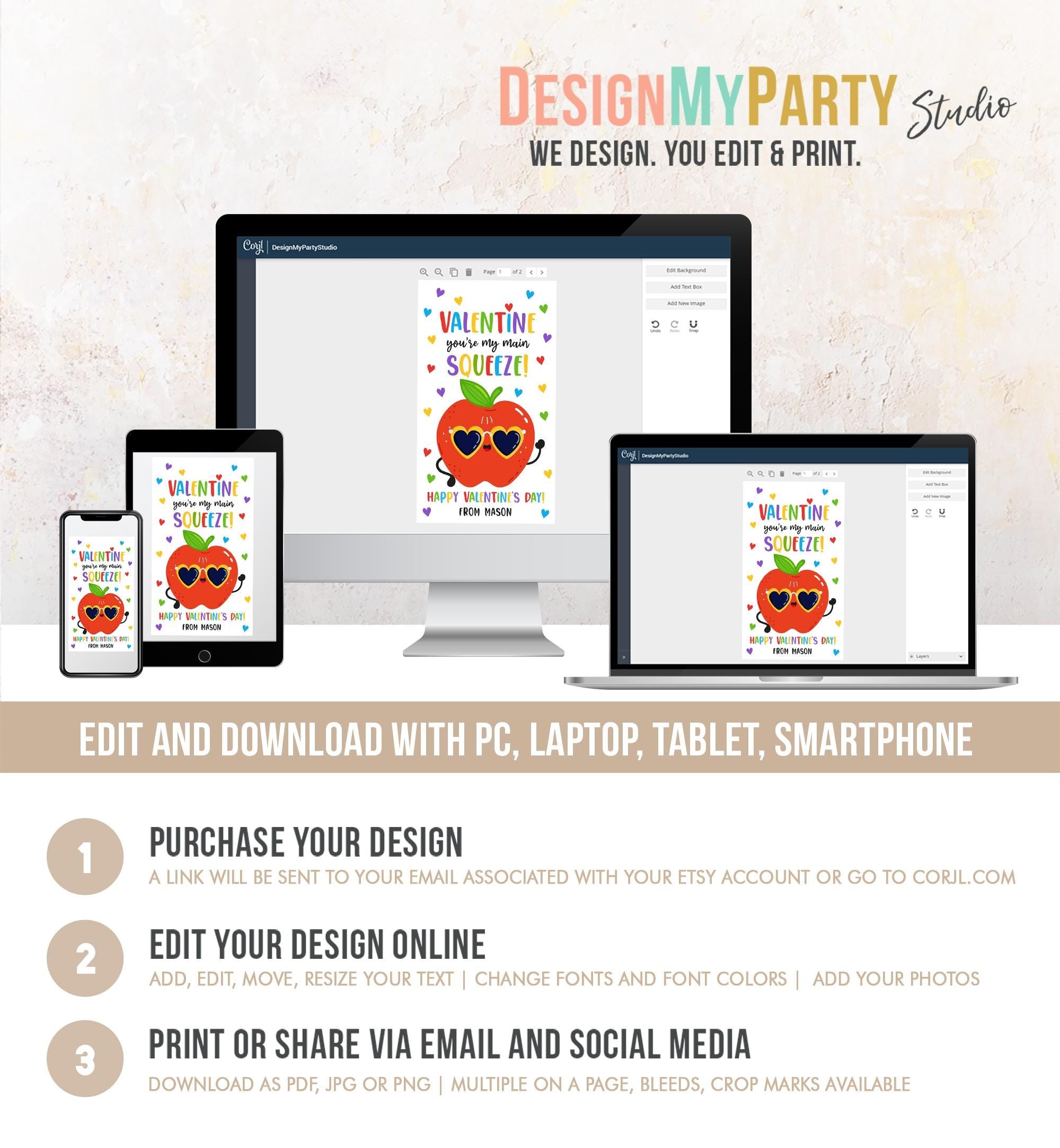 You can edit, add and remove text, font colors, move and resize the text boxes ("Valentine you're my Main Squeeze" is NOT editable).