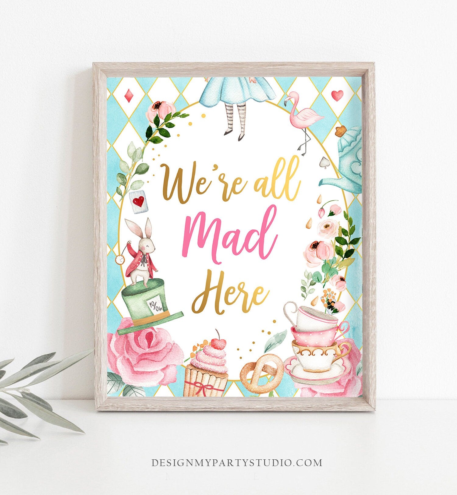 • We're All Mad Here Sign Alice in Wonderland Party Decor Onederland Girl Birthday Table Sign Decorations Digital Download PRINTABLE 0350